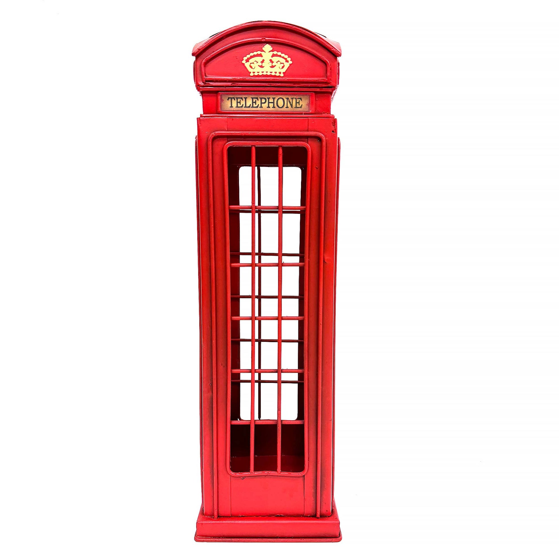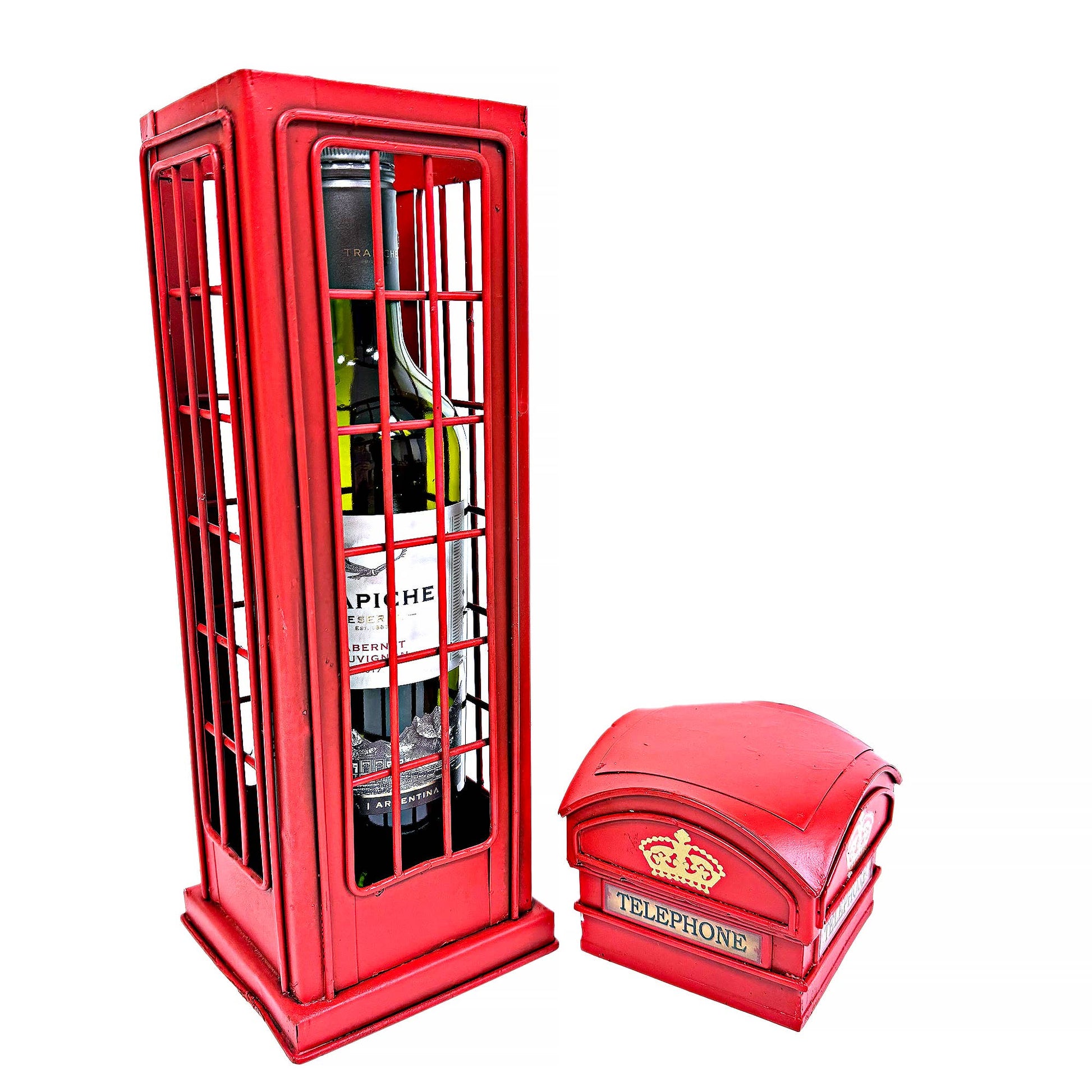 Step back in time with Boxman's Metal Telephone Box Single Wine Carrier. Not just a wine carrier, this unique piece doubles as a display shelf, adding a unique touch to your home decor. Inspired by iconic British telephone boxes, it's an inventive blend of form and function. Trust in Boxman's expertise in home decor to bring you this unique conversation starter.